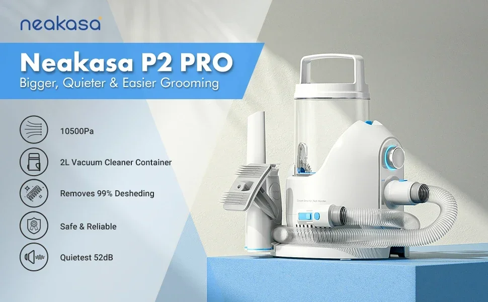 Neakasa P2 Pro, an all-in-one grooming tool kit that is simple to use, effective and affordable. It provides 5 Proven Grooming Tools and collects 99% of pet hair with a vacuum built-in. Features a powerful vacuuming system that brings your grooming to the next level. Specially designed for home pets, its vacuuming collects harmful particles from grooming.