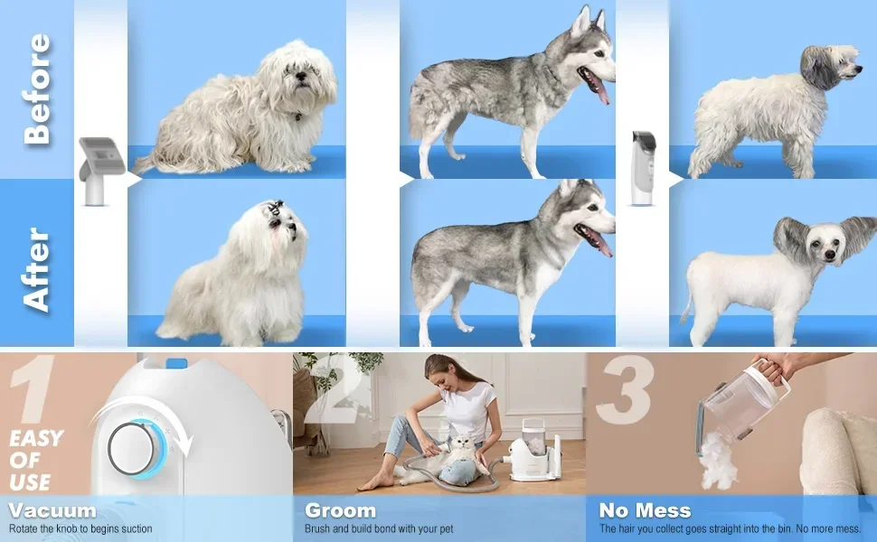 Electric Clipper with a sharp stainless steel blade makes it easy to remove excess fur that may make them uncomfortable in hot weather. Of course, the vacuum will clean up during operation, eliminating the need to clean anything later. Hair groomers with vacuum systems provide comfortable haircuts for our lovely pets.