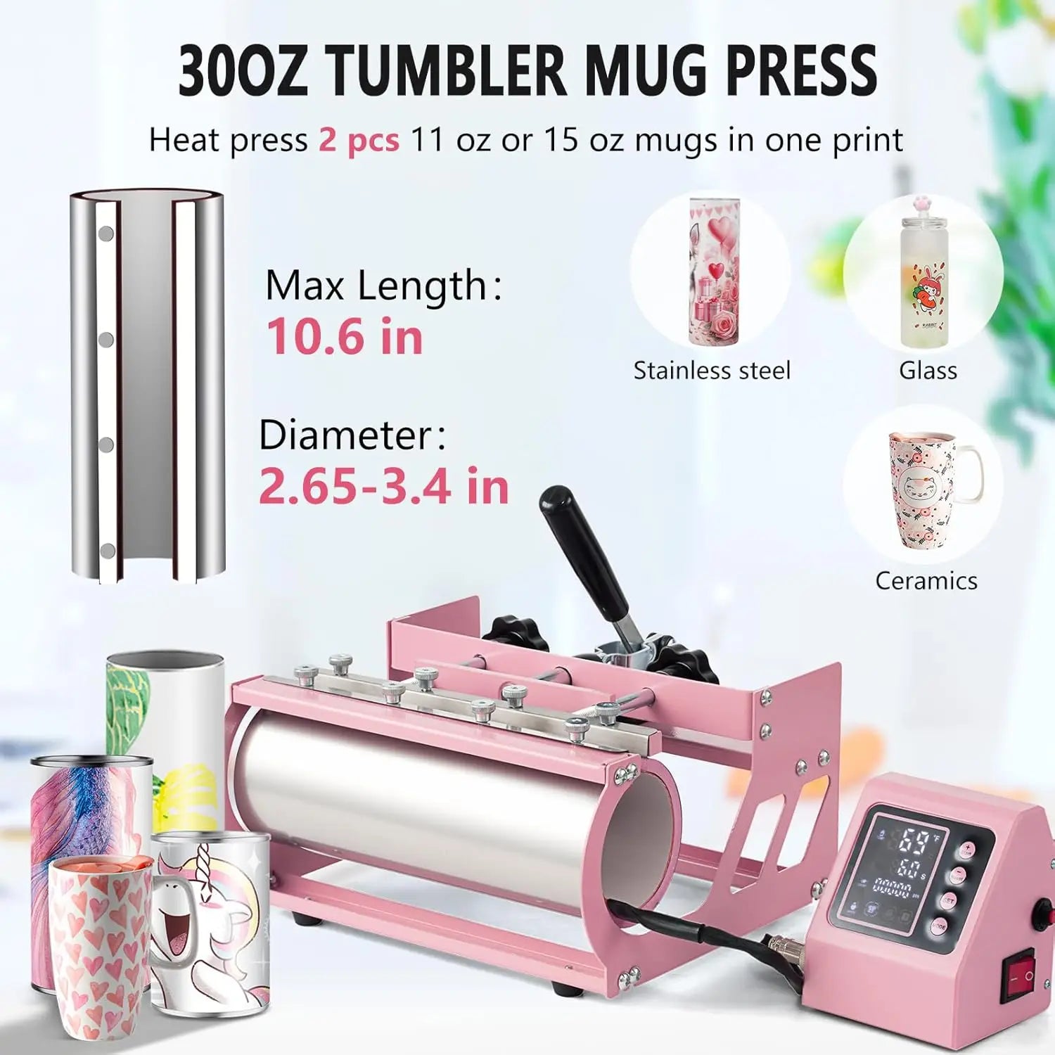 EXCELLENT PARAMETERS:Heater Longth: 10.6 Inch/27 CM, Diameter Range 2.6-3.4inch/6.6-8.6CM, The extra long heating element gives you the ability to easily print any size skinny tumbler, suitable for 16 & 20oz & 30 oz skinny tumbler, straight mugs and tumblers. This is the ideal heat press for anybody looking to increase their productivity, and take their business to the next level.